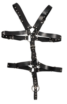 - Harness aus chromfrei gegerbten Leder mit Penis- oder Hodenring aus Metall (Ø 5 cm).