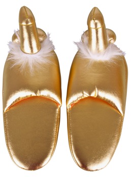 Diese weichen, goldfarbenen Hausschuhe sind der absolute Hingucker, denn auf der Schuhspitze bittet ein steifer Penis mit prallen Hoden um Beachtung… Einheitsgröße: ca. 37 bis 43. Material: Bezug 100% Polyester, Futter 100% Polypropylen.
