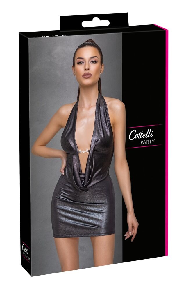 - Schnitt & Material: Kurzes Kleid im schillernden Silberglanz. Enge taillierte Schnittführung mit extra tiefem Wasserfall-Ausschnitt, der nur von einer Strassspange zusammengehalten wird. Mit Neckholder - rückenfrei. 92% Polyester, 8% Elasthan.