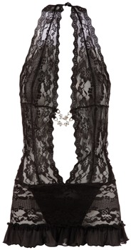 - Schnitt & Material: Kleid aus floraler Spitze. Neckholder. Tiefer Ausschnitt, der in der Front mit 2 Zierketten. Rücken komplett frei. Inklusive eingenähtem String ouvert. Änderung der Spitze vorbehalten. 94% Polyamid, 6% Polyester.