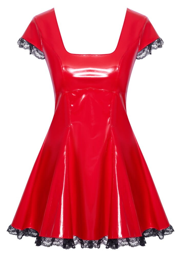 Zuckersüßes Design in sündig rot glänzendem Lack! Garniert mit schwarzen Spitzenrüschen an Ärmeln und Saum. Ein Style, der auffällt und gefällt! Obenrum kurvenbetonend tailliert und mit verführerischem Karree-Ausschnitt. Untenrum swingt das Röckchen frech um deine Hüften. Auch dein Rücken wird mit dem schönen runden Ausschnitt verzücken. Und mit dem Reißverschluss ist das Kleidchen bequem und schnell an- & ausgezogen. Ein roter Traum für Girlies und Ladies, die Fantasien beflügeln wollen!