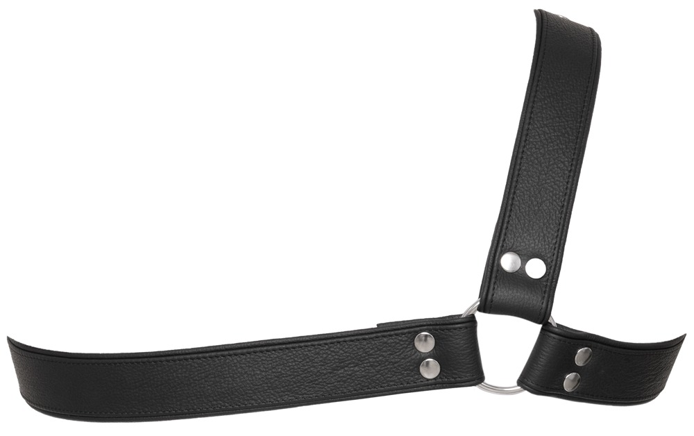 - Schnitt & Material: Einseitiges, schwarzes Brustharness aus Leder. Riemen 4 cm breit, verbunden mit großen Ringen; mit Druckknöpfen verstellbar. Leder (Rind), Metall.