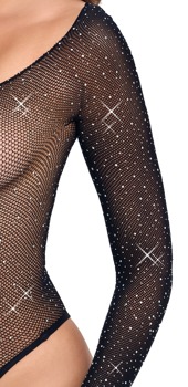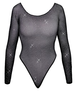 - Schnitt & Material: Schwarzer Langarm-Body aus Netz, komplett mit verschieden großen Glitzersteinchen besetzt. Großzügig ausgeschnitten, Riostring-Style mit hohen Beinausschnitten. 94% Polyamid, 6% Elasthan.