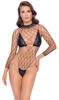 - Schnitt & Material: Schwarzer Langarm-Netzbody mit großen Maschen. An Hals und Armabschlüssen feinere Netzstrukturen. Im Rücken großer Ausschnitt. Rio-Style mit hohen Beinausschnitten. 90% Polyamid, 10% Elasthan.