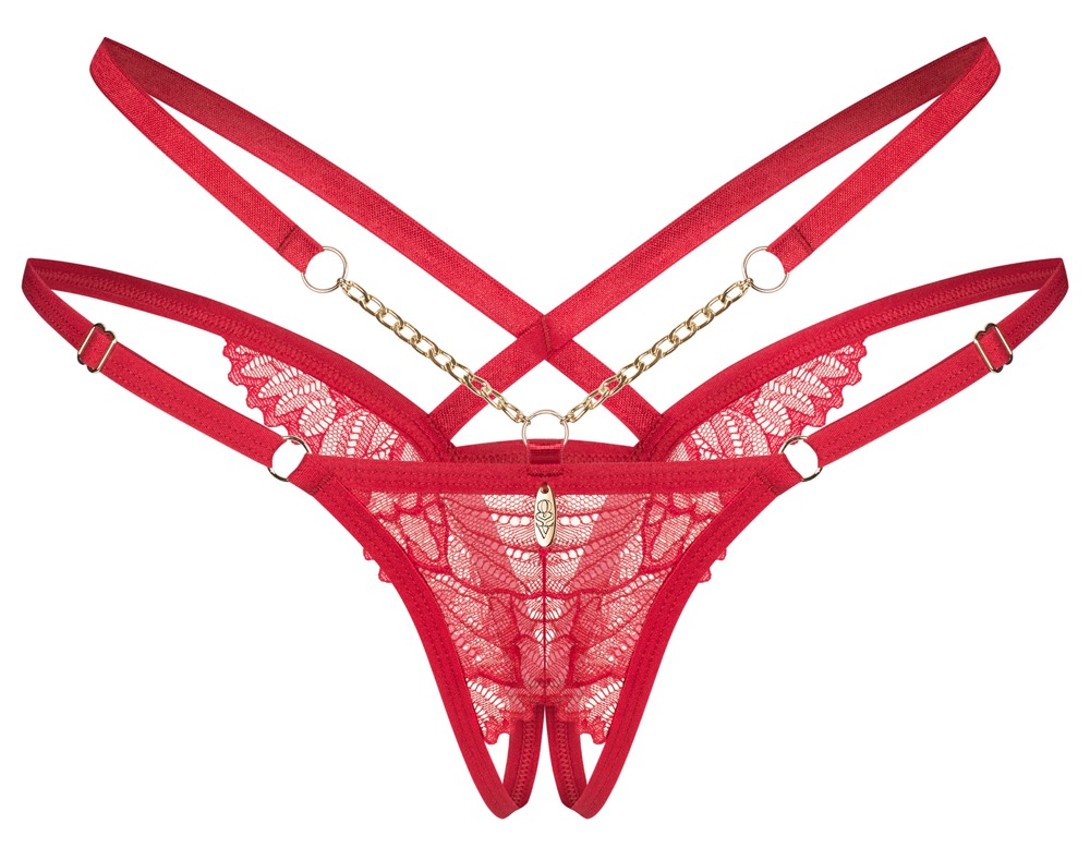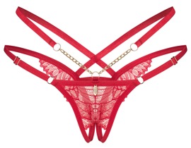 - Schnitt & Material: Riostring ouvert im Riemenstyle. In tiefem Rot mit Spitze und goldfarbenen Details. 2 Kettchen und leines Schmuckelement vorne. Unterer String-Riemenbund verstellbar. Im Schritt offen. 90% Polyamid, 10% Elasthan.