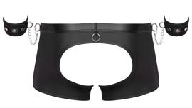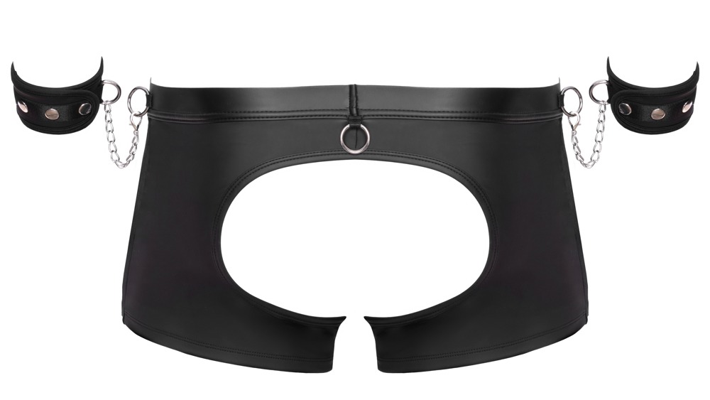- Schnitt & Material: Schwarze Pants inklusive Soft-Handfesseln. Po-freie Pants im Mattlook mit Netz, silberfarbene Metalldetails. Reißverschluss im Beutel. Bezogener Bund und jeweils seitlich Fesselringe für beiliegende Handfesseln mit Karabinerketten. Softe Mattlook-Manschetten mit Klettverschlüssen verstellbar. 90% Polyester, 10% Elasthan, Polyurethan-Beschichtung; Netz 90% Polyamid, 10% Elasthan.