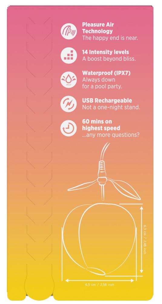 Klein, handlich, süß und stylisch – und herrlich verspielt! Der Pulsator begeistert mit seinem süßen Pfirsich-Design und ist der absolute Kick in Solo-Momenten oder bei extra viel Spaß zu zweit. Erlebe dank innovativer Pleasure Air Technologie intensive Orgasmen, wie du sie noch nie zuvor gespürt hast! Sanfte Luftschwingungen verwöhnen berührungslos deine Klitoris und jeden äußeren Lustpunkt – für Genuss auf einem ganz neuen Level.