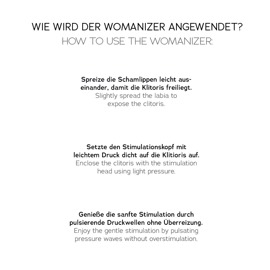 Der Womanizer Pro ist spielend leicht anwendbar: Spreize zunächst deine Vulvalippen leicht auseinander, damit die Klitoris freiliegt. Dann setzt du den Stimulationsaufsatz auf deine Liebesperle. Per Knopfdruck startest und steuerst du die Luftschwingungen in 11 Intensitäten – schon kann das Vergnügen beginnen! Etwas wasserbasiertes Gleitgel sorgt für die Extraportion Geschmeidigkeit. Probier es aus!