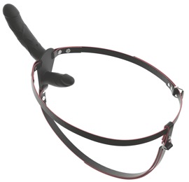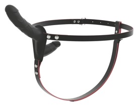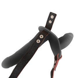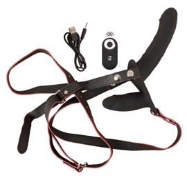 - Double Strap-on – Umschnallstring aus stilvollem Lederimitat mit abnehmbarem Doppel-Naturvibrator (wiederaufladbar) und Fernbedienung (inkl. Batterie).