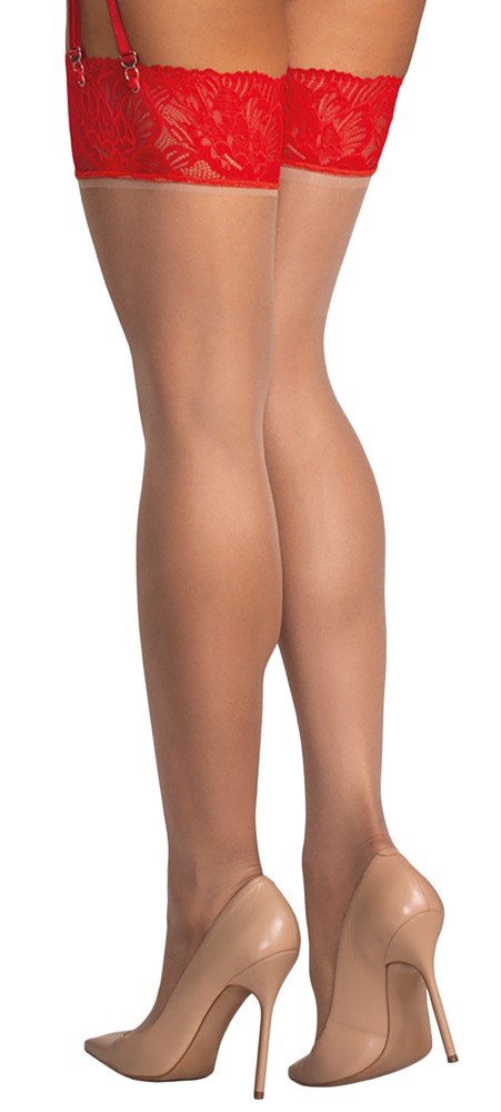 Diese seidigen Strümpfe vereinen zeitlose Eleganz mit einem Hauch Verführung: Die dekorativen, roten Spitzenabschlüsse setzen aufregende Akzente und sorgen für echten Sex-Appeal. Das weiche, seidig anschmiegsame Material bietet höchsten Tragekomfort, während die breiten, elastischen Spitzenabschlüsse optimalen Halt für deine Strumpfhalter-Clips bieten.