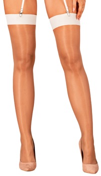 Klassische nudefarbene Strümpfe S814 von Obsessive mit Abschluss in romantischem Weiß. Zeitlos und elegant schmiegen sie sich ans Bein. Der breite softe Abschluss ist komfortabel elastisch und bietet perfekten Halt für die Strumpfhalter-Clips.