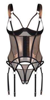 - Schnitt & Material: Busenfreies Strapshemd inklusive String ouvert. Bronzefarben-semitransparent mit edlem Schimmer, schwarze Details und Ringe. Leicht gepolsterte Bügel-Cups mit busenumrahmenden Riemchen. Träger, Strumpfhalter und Hakenverschlussleiste im Rücken verstellbar. String im Schritt offen. 95% Polyester, 5% Elasthan.