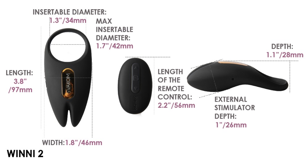 - Lieferumfang: 1 x Vibro-Penisring Winni 2 von SVAKOM. Inklusive USB-Ladekabel, Aufbewahrungsbeutel und Batterien für die Fernbedienung.